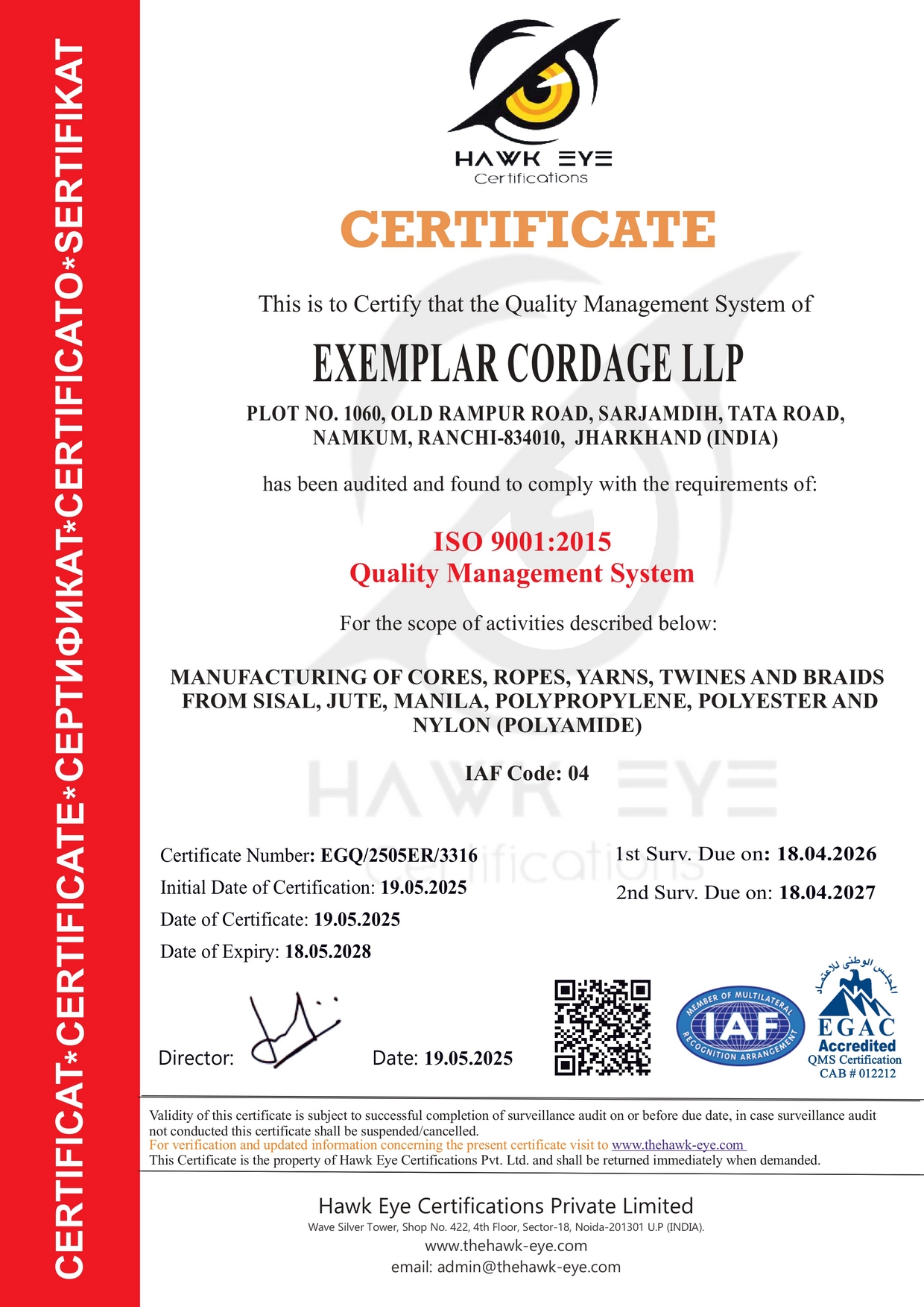 Exemplar Cordage LLP is an ISO 9001:2015 certified company, which manufactures and exports high-quality ropes, core, yarns, twines, & braids from both natural and manmade fibers like Sisal, Manila, Jute, Polypropylene, Polyester, Nylon, etc.